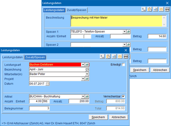 Optionale LeistungserfassungDie optionale Leistungserfassung dient dazu, um schnell einzelne Leistungen, z.B. Stunden oder Einzellieferungen zu erfassen. Der Leistungsartenstamm steuert die Dateneingabe, so dass möglichst wenig Daten erfasst werden müssen. Auf Abruf werden aus allen, oder ausgewählten Leistungen, Sammel-Rechnungen erstellt. Aus den einzelnen Leistungseinträgen werden automatisch Auftragspositionen mit Datum und weiteren Details. Diese können anschliessend wie "manuelle" Aufträge in der Auftragsbearbeitung weiter bearbeitet werden. Es ist eine sinnvolle Ergänzung des ERP-Programms Abex Visual-Adress. |
